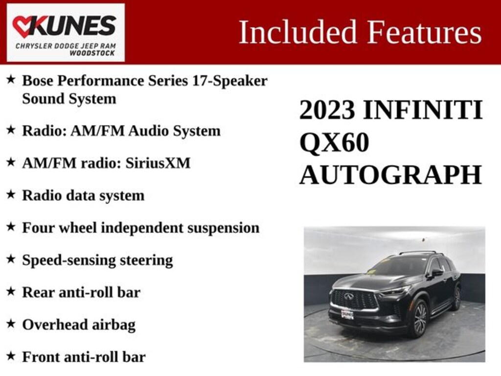 Recent Arrival! Certified. 2023 INFINITI QX60 Autograph AWD Mineral Black AM/FM radio: SiriusXM, Bose Performance Series 17-Speaker Sound System, Cargo Mat (Reversible), Delay-off headlights, Emergency communication system, First Aid Kit, Floor Mats on Captains Chair w/3rd Row Tray, Four wheel independent suspension, Front anti-roll bar, Front Center Armrest, Front reading lights, Leather Shift Knob, Occupant sensing airbag, Overhead airbag, Panic alarm, Radio data system, Radio: AM/FM Audio System, Rear anti-roll bar, Rear reading lights, Reclining 3rd row seat, Semi Aniline Leather Seating Surfaces, Speed-sensing steering, Speed-Sensitive Wipers, Split folding rear seat, Tachometer, Telescoping steering wheel, Tilt steering wheel, Wheels: 20" x 8J Luxury Machined Aluminum Alloy.