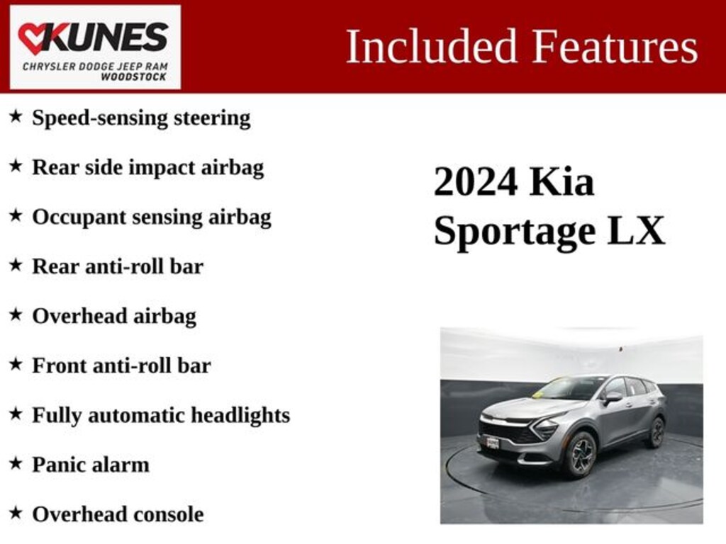 Beneath the hood, you'll find a range of impressive features that make this Sportage LX a standout in its class. Enjoy the convenience of speed-sensing steering, fully automatic headlights, and an illuminated entry system. Stay connected with the AM/FM/HD audio system, while the tilt and telescoping steering wheel and driver's armrest provide exceptional comfort.
