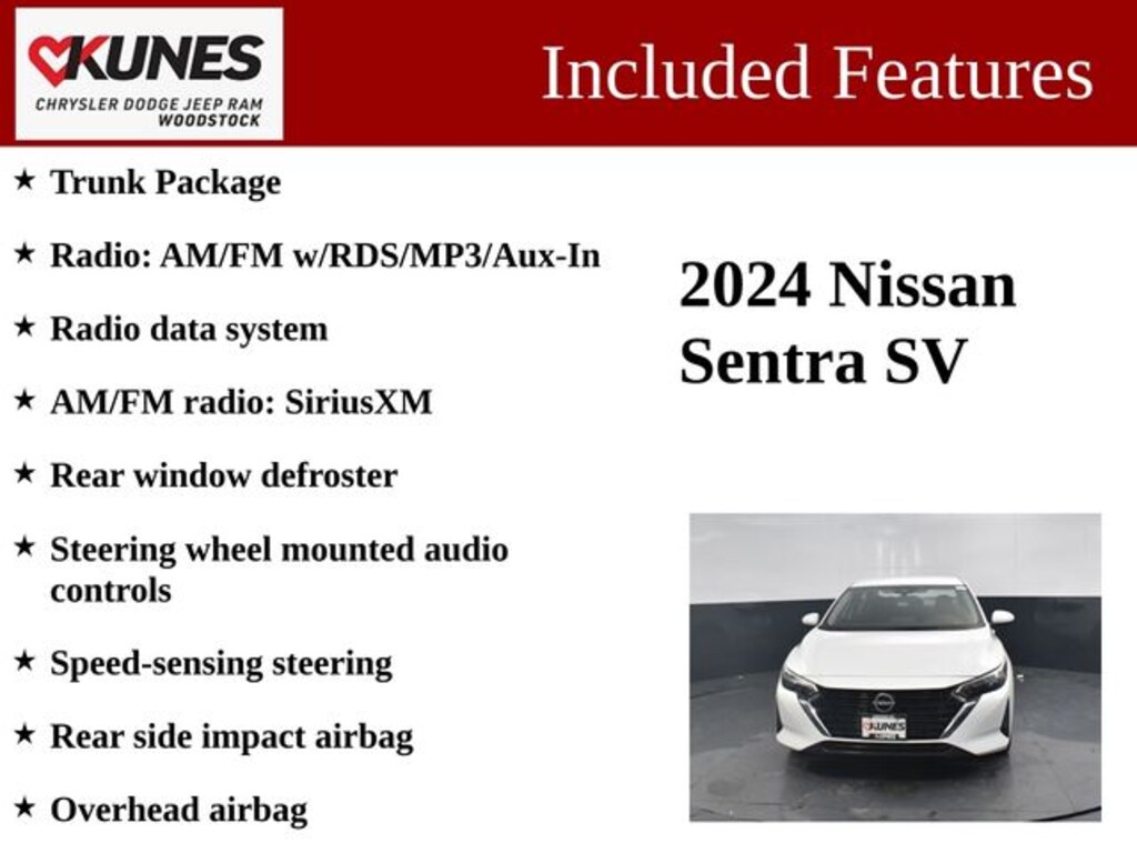 Recent Arrival! Certified. 2024 Nissan Sentra SV FWD Fresh Powder CVT with Xtronic, Charcoal Cloth, AM/FM radio: SiriusXM, Brake assist, Delay-off headlights, Driver vanity mirror, Front Center Armrest, Front reading lights, Fully automatic headlights, Hide-A-Way Trunk Net, Illuminated entry, Knee airbag, Leather steering wheel, Low tire pressure warning, Occupant sensing airbag, Outside temperature display, Overhead airbag, Overhead console, Panic alarm, Passenger door bin, Passenger vanity mirror, Radio data system, Radio: AM/FM w/RDS/MP3/Aux-In, Rear side impact airbag, Rear window defroster, Speed control, Speed-sensing steering, Split folding rear seat, Steering wheel mounted audio controls, Tachometer, Technical Spec Change 2, Trip computer, Trunk Package, Variably intermittent wipers.
