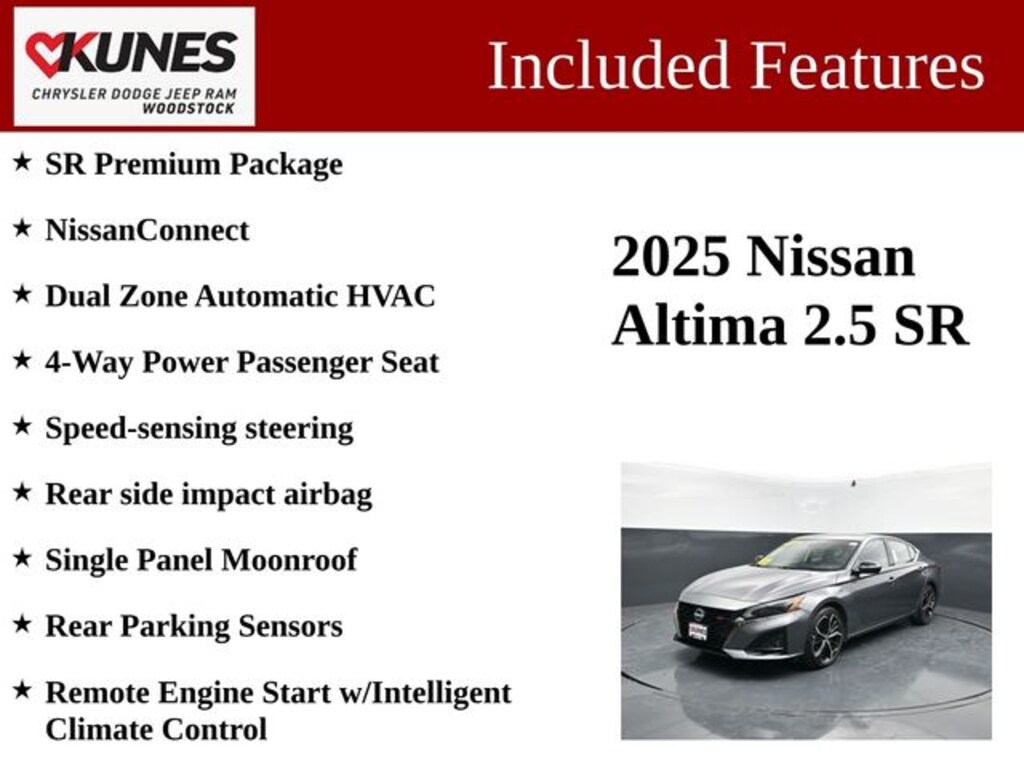 Discover the perfect blend of style, performance, and technology in the 2025 Nissan Altima 2.5 SR. This exceptional sedan is a true standout, combining sophisticated design, advanced features, and a thrilling driving experience that will captivate you from the moment you get behind the wheel.