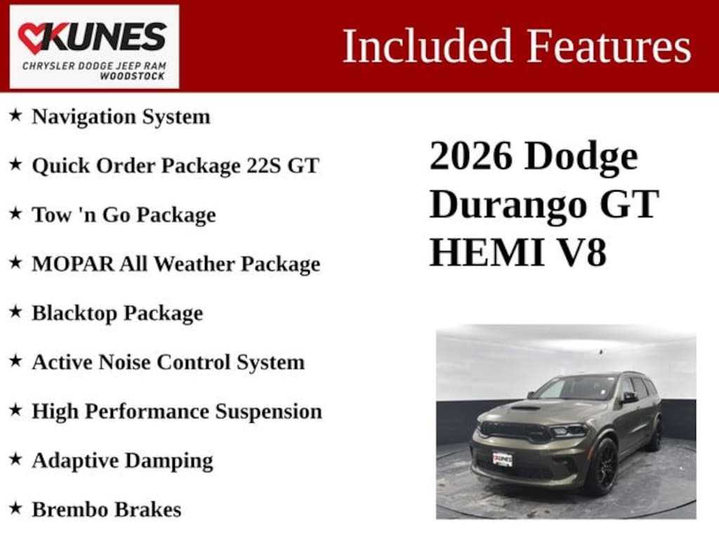 Discover the ultimate in performance, capability, and luxury with the 2026 Dodge Durango GT HEMI V8. This exceptional SUV is waiting to elevate your driving experience. Contact us today to schedule a test drive and experience the power of the Durango GT for yourself.