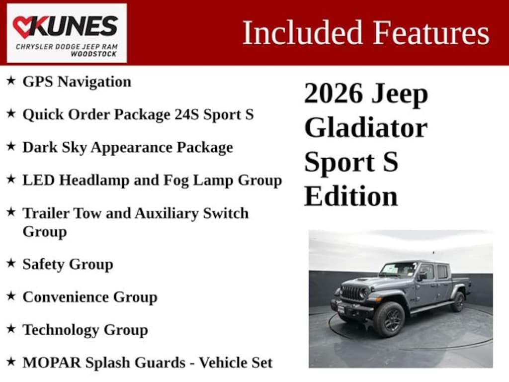Whether you're conquering the trails or navigating the city streets, the 2026 Jeep Gladiator Sport S is the ultimate companion for your adventurous lifestyle. Experience the perfect blend of capability, technology, and style. Visit our showroom today and let us demonstrate how this exceptional vehicle can elevate your driving experience. Price includes: $1000 - 2026 Midwest BC Bonus Cash . Exp. 04/30/2026 $1000 - 2026 National Retail Bonus Cash . Exp. 04/30/2026 $2000 - 2026 Midwest BC SFS Retail Bonus Cash. Exp. 04/30/2026