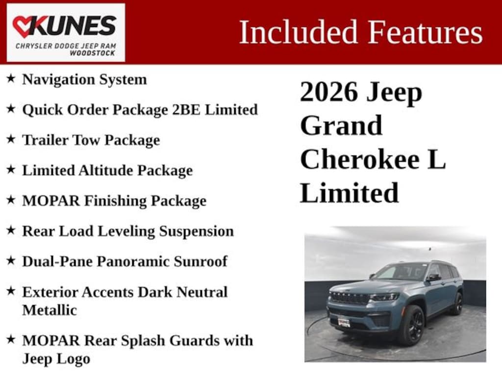 With a starting price of $53,102, the 2026 Jeep Grand Cherokee L Limited represents an unbeatable value in the luxury SUV segment. Experience the pinnacle of Jeep's engineering and design by scheduling a test drive today. We're confident that once you get behind the wheel, you'll be captivated by the sheer power, sophistication, and capability of this remarkable vehicle. Price includes: $1000 - 2026 Midwest BC SFS Retail Bonus Cash. Exp. 04/30/2026 $1500 - 2026 National Retail Bonus Cash . Exp. 04/30/2026