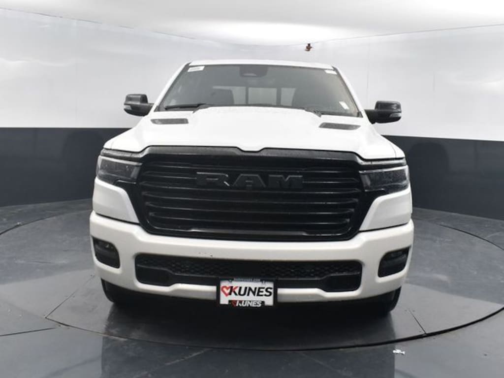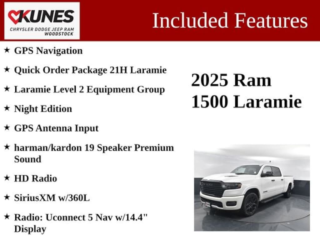 3 Rear Seat Head Restraints, 4 Way Front Headrests, 4G LTE Wi-Fi Hot Spot, Accent Color Door Handles, Accent Color Premium Power Mirrors, Accent Color Tailgate Handle, Apple CarPlay, Auto Power-Folding Mirrors, Auto-Dimming Exterior Driver Mirror, Black Exterior Truck Badging, Black Headlamp Bezels, Black Interior Accents, Black Painted Exterior Mirrors Caps, Black Tail Lamp Bezels, Body Color Front Bumper, Body Color Rear Bumper w/Step Pads, Bucket Seats, Cluster 12" TFT Color Display, Connected Travel & Traffic Services, Connectivity - US/Canada, Convex Wide-Angle Exterior Mirror Insert, Driver Seat Memory, Dual Exhaust w/Black Tips, Exterior Front Lighting Animation, Exterior Mirrors Approach Lamps, Exterior Mirrors w/Heating Element, Exterior Mirrors w/Memory, Exterior Mirrors w/Supplemental Signals, Exterior Rear Lighting Animation, Front Passenger Interactive Display, Front Seat Back Map Pockets, Full Length Upgraded Floor Console, Google Android Auto, GPS Antenna Input, GPS Navigation, Grille Surround 3 Black Texture 2 Black, harman/kardon 19 Speaker Premium Sound, HD Radio, Heated Front Seats, Heated Second Row Seats, Heated Steering Wheel, Integrated Voice Command w/Bluetooth, Laramie Level 2 Equipment Group, Leather Trimmed Bucket Seats, Night Edition, Pirelli Brand Tires, Power 2-Way Driver Lumbar Adjust, Power 2-Way Passenger Lumbar Adjust, Power Adjust 8-Way Driver Seat, Power Adjust 8-Way Front Passenger Seat, Power Tailgate, Proximity Approach/Departure Lamps, Quick Order Package 21H Laramie, Radio: Uconnect 5 Nav w/14.4" Display, Rain Sensitive Windshield Wipers, RAM Grille Badge - Black, Rear 60/40 Folding Split Recline Seat, SiriusXM w/360L, Sport Performance Hood, USB Host Flip, Ventilated Front Seats, Wheels: 22" x 9" Forged Aluminum.