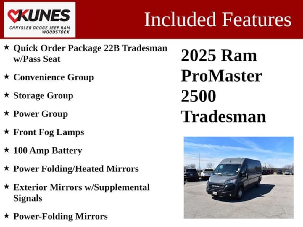100 Amp Battery, 115V Auxiliary Power Outlet, 12V Rear Auxiliary Power Outlet, 4-Way Manual Adjust Front Passenger Seat, Cargo Net, Convenience Group, Exterior Mirrors w/Heating Element, Exterior Mirrors w/Supplemental Signals, Front Fog Lamps, Passenger Bucket Seat, Power Adjust Mirrors, Power Folding/Heated Mirrors, Power Group, Power-Adjustable Convex Aux Mirrors, Power-Folding Mirrors, Quick Order Package 22B Tradesman w/Pass Seat, Rear Cargo LED Lamp, Shelf Above Roof Trim, Storage Group, Underseat Storage Tray.