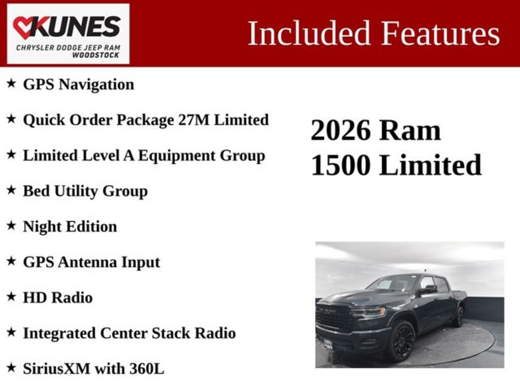 Experience the unparalleled combination of capability, technology, and refinement that this 2026 Ram 1500 Limited has to offer. Visit our showroom today and let us demonstrate how this exceptional truck can transform your driving experience. Price includes: $1000 - 2026 National Bonus Cash . Exp. 03/31/2026 $3500 - 2026 National Retail Bonus Cash . Exp. 03/31/2026