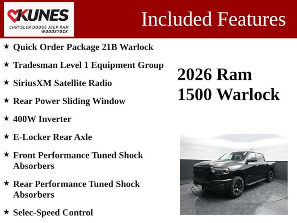 Experience the power and refinement of the 2026 Ram 1500 Warlock. Visit our showroom today and let us demonstrate how this exceptional truck can elevate your driving experience. We're confident that once you take it for a test drive, you'll be convinced that this is the ultimate choice for your next vehicle. Price includes: $3500 - 2026 National Retail Bonus Cash . Exp. 04/30/2026
