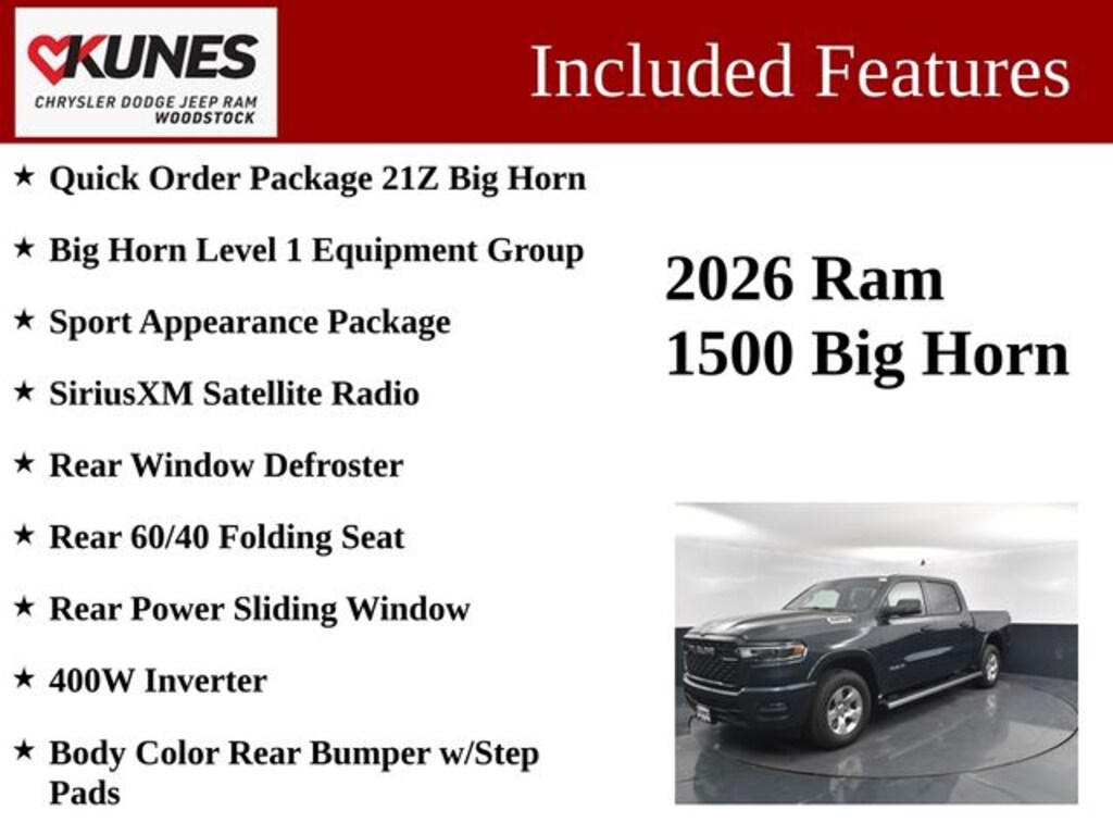 115V Auxiliary Power Outlet, 2nd Row In Floor Storage Bins, 3 Rear Seat Head Restraints, 4 Way Front Headrests, 400W Inverter, Auto Power-Folding Mirrors, Auto-Dimming Exterior Driver Mirror, Auto-Dimming Rear-View Mirror, Big Horn Level 1 Equipment Group, Black Exterior Mirrors, Black Interior Accents, Black Premium Power Mirrors, Body Color Door Handles, Body Color Fender Flares, Body Color Front Bumper, Body Color Rear Bumper w/Step Pads, Body Color Tailgate Handle, Bucket Seats, Center Console Parts Module, Convex Wide-Angle Exterior Mirror Insert, Deluxe Cloth Bucket Seats, Exterior Mirrors Courtesy Lamps, Exterior Mirrors w/Heating Element, Exterior Mirrors w/Supplemental Signals, Front Seat Back Map Pockets, Full Length Floor Console, Glove Box Lamp, Grille Surround 1 Body Color Texture 1 Black, Heated Front Seats, Heated Steering Wheel, Leather Wrapped Steering Wheel, Manual Adjust 4-Way Front Passenger Seat, Power 2-Way Driver Lumbar Adjust, Power Adjust 8-Way Driver Seat, Power Adjustable Pedals, Quick Order Package 21Z Big Horn, RAM Grille Badge - Chrome, Rear 60/40 Folding Seat, Rear Center Armrest, Rear Dome w/On/Off Switch Lamp, Rear Power Sliding Window, Rear Window Defroster, Secondary Active Grille Shutters, SiriusXM Radio Service, SiriusXM Satellite Radio, Sport Appearance Package, Steering Wheel Mounted Audio Controls, Sun Visors w/Illuminated Vanity Mirrors.