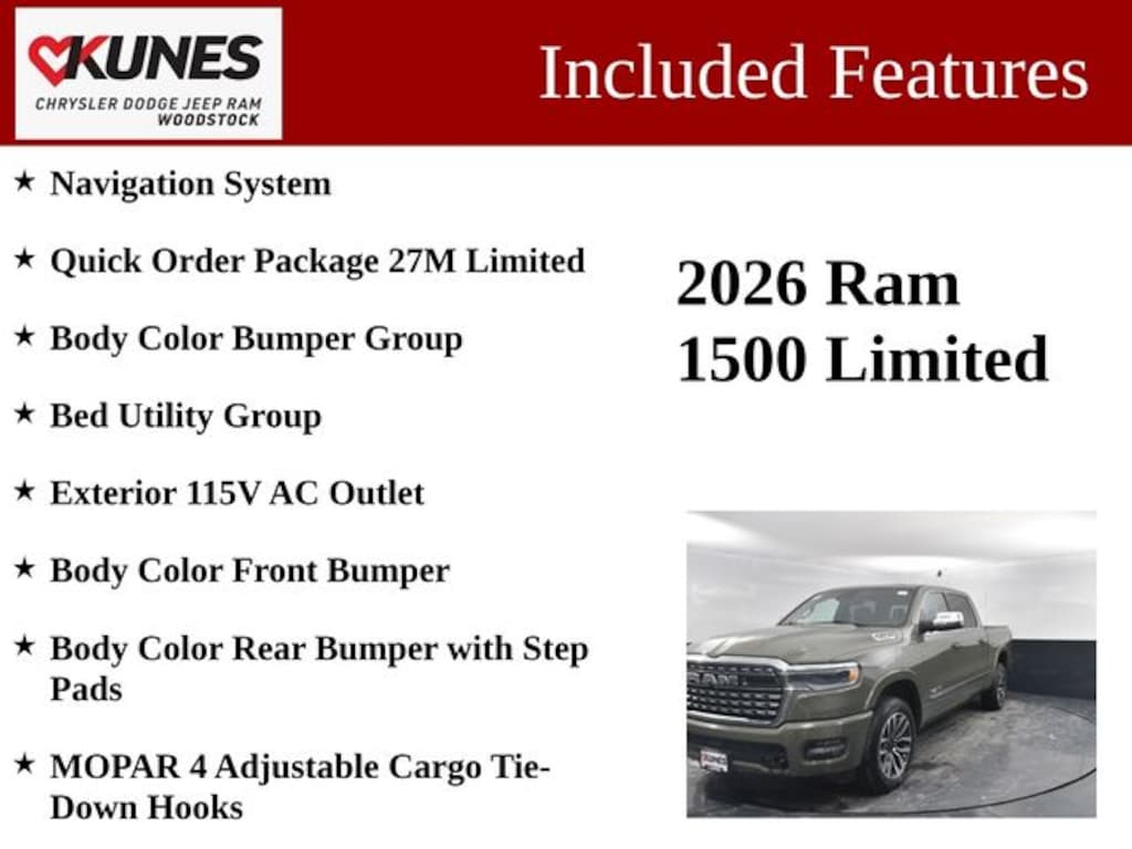 Experience the pinnacle of truck engineering and design with this 2026 Ram 1500 Limited. Discover the perfect blend of power, luxury, and technology that will elevate your driving experience to new heights. Visit our showroom today and let us demonstrate why this exceptional vehicle is the perfect choice for you. Price includes: $1000 - 2026 National Bonus Cash . Exp. 03/31/2026 $3500 - 2026 National Retail Bonus Cash . Exp. 03/31/2026