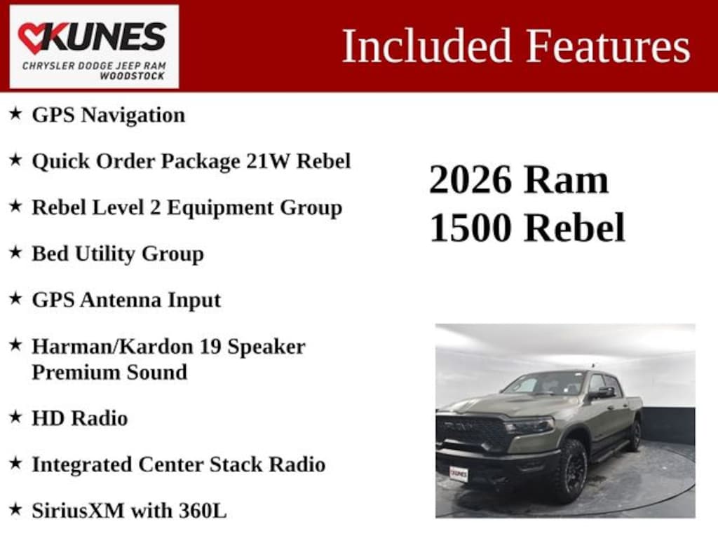 Whether you're tackling rugged terrain or navigating the city streets, this 2026 Ram 1500 Rebel is the perfect companion. Its combination of power, technology, and comfort makes it a standout in the competitive truck market. Experience the difference for yourself and schedule a test drive today. We're confident you'll be impressed by the exceptional value and uncompromising performance this Rebel has to offer. Price includes: $1000 - 2026 National Bonus Cash . Exp. 03/02/2026 $3500 - 2026 National Retail Consumer Cash . Exp. 03/02/2026