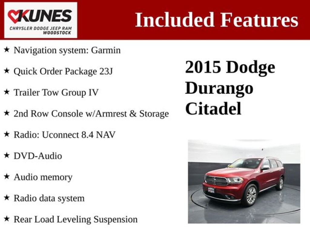 2015 Dodge Durango Citadel AWD Deep Cherry Red Crystal Pearlcoat AWD, 12V Auxiliary Power Outlet In Console, 2nd Row Console w/Armrest & Storage, 2nd Row Mini Console w/Cupholders, 3rd Row Floor Mat & Full Console, 3rd Row Floor Mat & Mini Console, 7 & 4 Pin Wiring Harness, Anti-whiplash front head restraints, Audio memory, Bumpers: body-color, Class IV Receiver Hitch, Compass, Driver door bin, DVD-Audio, Emergency communication system, Four wheel independent suspension, Front anti-roll bar, Front Center Armrest w/Storage, Heavy-Duty Engine Cooling, Illuminated entry, Illuminated Rear Cupholders, Navigation system: Garmin, Occupant sensing airbag, Outside temperature display, Overhead airbag, Overhead console, Power 8-Way Driver Memory 8-Way Passenger Seats, Power passenger seat, Quick Order Package 23J, Radio data system, Radio: Uconnect 8.4 NAV, Rear anti-roll bar, Rear Load Leveling Suspension, Rear reading lights, Rear seat center armrest, Rear window wiper, Split folding rear seat, Trailer Tow Group IV, USB Charging Port in Console, Wheels: 20" x 8.0" Fully Polished Aluminum.