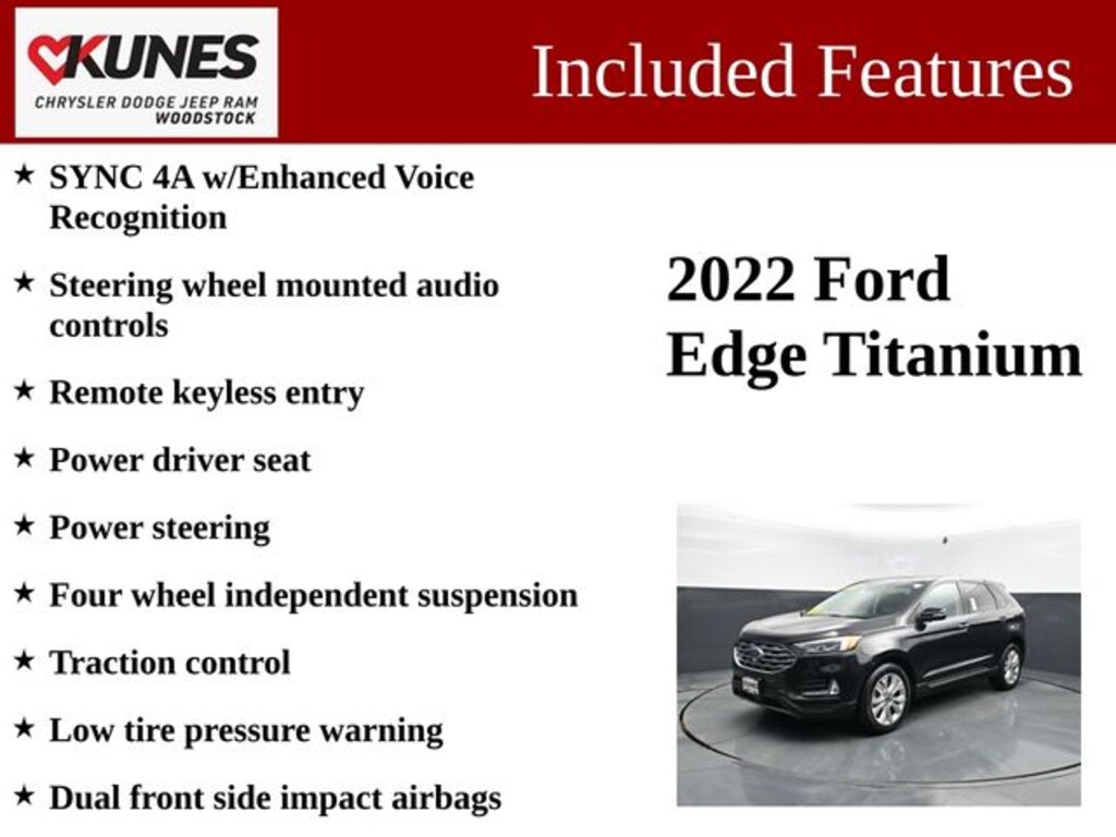 Your search ends at Kunes Chrysler Dodge Jeep Ram of Woodstock, a family-owned and -operated auto sales and service center that you can rely on. With perks like the No Fear Warranty and huge community outreach through the Kunes Family Foundation, doing business with us should be an easy choice to make. Come see how we've been making Illinois drivers happy for years and miles on end today! Kunes Chrysler Dodge Jeep Ram of Woodstock is conveniently located at 1790 South Eastwood Drive in Woodstock, Illinois, which is only a short trip for drivers coming from Crystal Lake, Lake in the Hills, Algonquin and beyond. When you want to buy a new Jeep or need to service your current ride, visit our award-winning dealership and get the experience that you deserve. While we make every effort to ensure the data listed here is correct, there may be instances where some of the options or vehicle features may be listed incorrectly as we get data from multiple data sources. PLEASE MAKE SURE to confirm the details of this vehicle with the dealer to ensure its accuracy. Dealer cannot be held liable for data that is listed incorrectly. Prices shown do not include taxes, license, and title fees and a $377.63 documentary service fee.