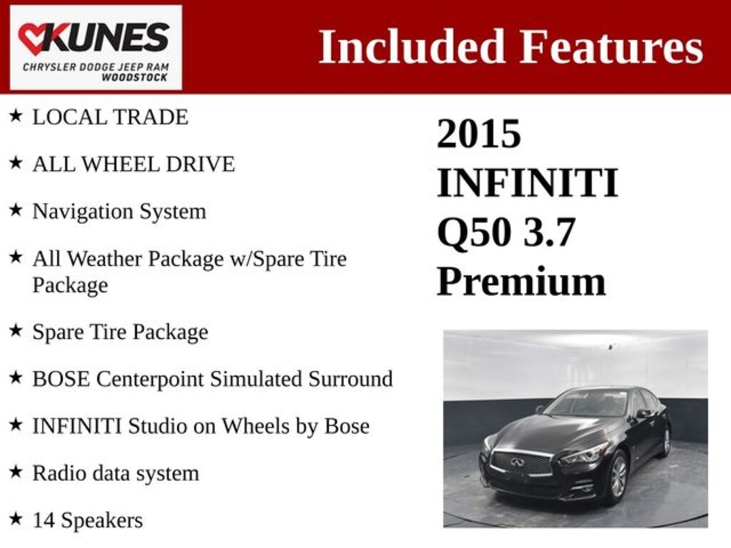 With its sleek, sculpted exterior and dynamic driving dynamics, the 2015 INFINITI Q50 Premium is a true standout in the luxury sedan segment. This well-maintained, local trade-in represents an exceptional value for discerning buyers seeking a premium driving experience.