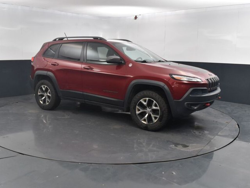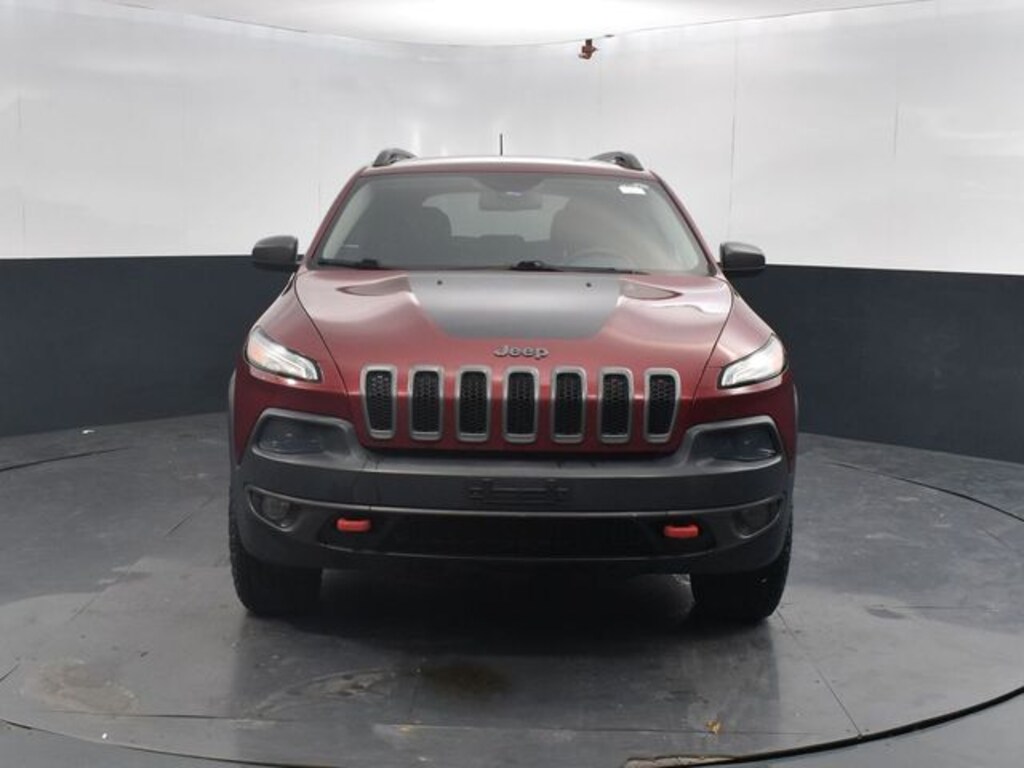 Recent Arrival! 2014 Jeep Cherokee Trailhawk 4WD Deep Cherry Red Crystal Pearlcoat Anti-whiplash front head restraints, Driver door bin, Emergency communication system, Four wheel independent suspension, Front Bucket Seats, Front Center Armrest, Front reading lights, Heated Front Seats, Heated Steering Wheel, Illuminated entry, Leather Interior Group, Leather Trimmed Bucket Seats, Navigation System, Occupant sensing airbag, Outside temperature display, Power 4-Way Driver Lumbar Adjust, Power 8-Way Driver Seat, Premium Cloth Low-Back Bucket Seats, Quick Order Package 27E, Radio data system, Radio: Uconnect 8.4A AM/FM/BT/Access, Rear reading lights, Rear seat center armrest, Speed-sensing steering, Split folding rear seat, Tachometer, Uconnect Access, Voltmeter.