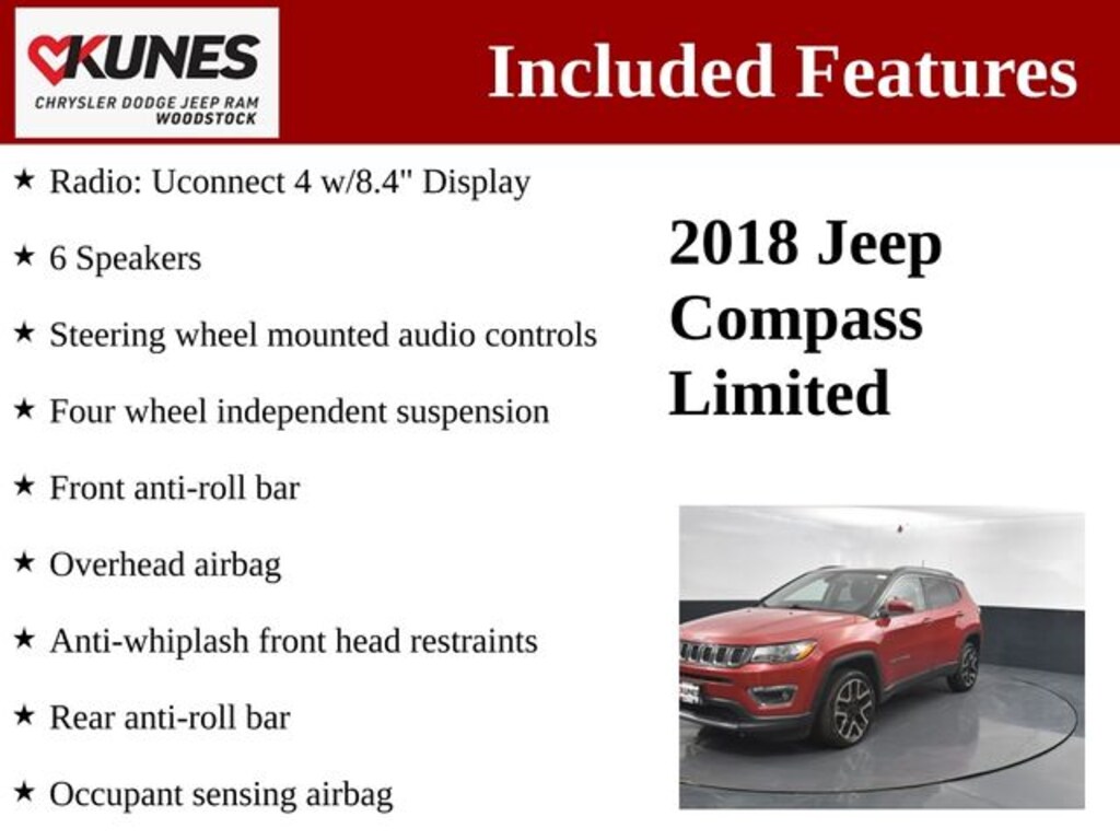 2018 Jeep Compass Limited 4WD Redline Pearlcoat 4WD, 6 Speakers, Anti-whiplash front head restraints, Bumpers: body-color, Delay-off headlights, Four wheel independent suspension, Front anti-roll bar, Front Bucket Seats, Front Center Armrest w/Storage, Front reading lights, Heated front seats, Illuminated entry, Occupant sensing airbag, Overhead airbag, Overhead console, Panic alarm, Radio: Uconnect 4 w/8.4" Display, Rear anti-roll bar, Rear seat center armrest, Roof rack: rails only, Speed control, Split folding rear seat, Steering wheel mounted audio controls, Tachometer, Wheels: 19" x 7.5" Polished/Black Pockets Aluminum.