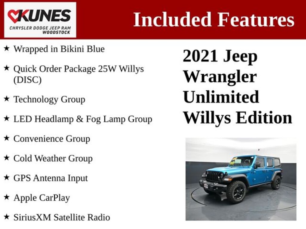 Your search ends at Kunes Chrysler Dodge Jeep Ram of Woodstock, a family-owned and -operated auto sales and service center that you can rely on. With perks like the No Fear Warranty and huge community outreach through the Kunes Family Foundation, doing business with us should be an easy choice to make. Come see how we've been making Illinois drivers happy for years and miles on end today! Kunes Chrysler Dodge Jeep Ram of Woodstock is conveniently located at 1790 South Eastwood Drive in Woodstock, Illinois, which is only a short trip for drivers coming from Crystal Lake, Lake in the Hills, Algonquin and beyond. When you want to buy a new Jeep or need to service your current ride, visit our award-winning dealership and get the experience that you deserve. While we make every effort to ensure the data listed here is correct, there may be instances where some of the options or vehicle features may be listed incorrectly as we get data from multiple data sources. PLEASE MAKE SURE to confirm the details of this vehicle with the dealer to ensure its accuracy. Dealer cannot be held liable for data that is listed incorrectly. Prices shown do not include taxes, license, and title fees and a $377.63 documentary service fee.