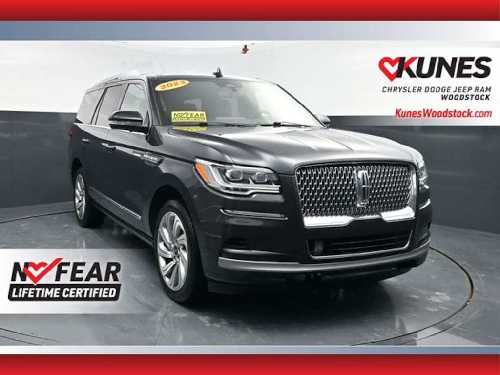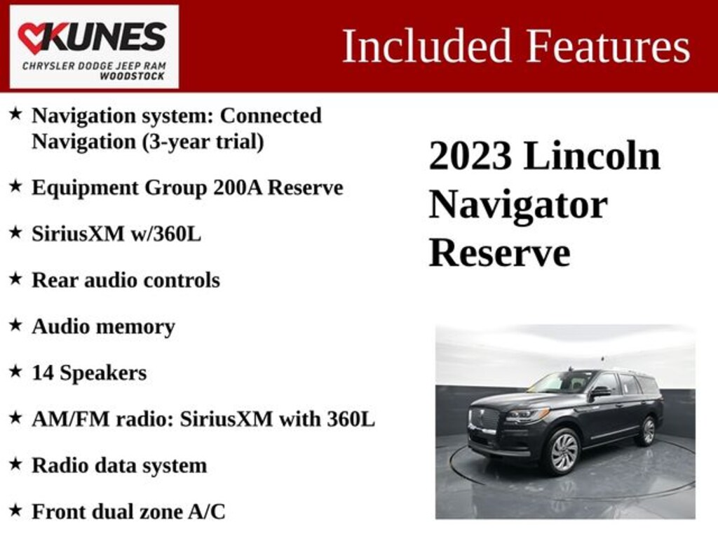 Certified. 2023 Lincoln Navigator Reserve 4WD Starlight 4WD, Black Onyx Leather, 14 Speakers, Adjustable pedals, Alloy wheels, AM/FM radio: SiriusXM with 360L, Audio memory, Auto Start-Stop Technology, Auto tilt-away steering wheel, Auto-dimming door mirrors, Auto-dimming Rear-View mirror, Auto-leveling suspension, Brake assist, Bumpers: body-color, Delay-off headlights, Driver door bin, Driver vanity mirror, Driver's Seat Mounted Armrest, Dual front side impact airbags, Electronic Stability Control, Emergency communication system: 911 Assist, Equipment Group 200A Reserve, Four wheel independent suspension, Front anti-roll bar, Front dual zone A/C, Front fog lights, Front reading lights, Garage door transmitter, Genuine wood door panel insert, Hands-Free Liftgate Delete, Head restraints memory, Heated door mirrors, Heated rear seats, HVAC memory, Illuminated entry, Navigation system: Connected Navigation (3-year trial), Occupant sensing airbag, Outside temperature display, Overhead airbag, Overhead console, Panic alarm, Passenger seat mounted armrest, Passenger vanity mirror, Pedal memory, Power adjustable rear head restraints, Power door mirrors, Power Liftgate, Power windows, Radio data system, Rain sensing wipers, Rear air conditioning, Rear anti-roll bar, Rear audio controls, Rear reading lights, Rear window defroster, Rear window wiper, Remote keyless entry, SiriusXM w/360L, Speed control, Speed-sensing steering, Speed-Sensitive Wipers, Split folding rear seat, Spoiler, Steering wheel memory, Steering wheel mounted audio controls, Trip computer, Turn signal indicator mirrors, Variably intermittent wipers, Ventilated rear seats, Wheels: 22" Bright Machined Aluminum.