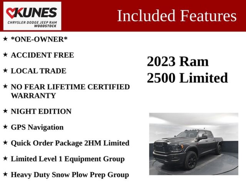 Certified. 2023 Ram 2500 Limited 4WD Granite Crystal Metallic Clearcoat *ONE-OWNER*, ACCIDENT FREE, LOCAL TRADE, NO FEAR LIFETIME CERTIFIED WARRANTY, NIGHT EDITION, 12" Touchscreen Display, 17 Speaker harman/kardon Premium Sound, 220 Amp Alternator, 4 Adjustable Cargo Tie-Down Hooks, 4G LTE Wi-Fi Hot Spot, Adaptive Cruise Control w/Stop, Adaptive Steering System, Alexa Built-In, Apple CarPlay, Black Exterior Truck Badging, Black Grille Limited, Black Headlamp Bezels, Black Ram Head Tailgate Badge, Black Tail Lamp Bezels, Black Wheel Center Hub, Body Color Grille Surround, Connected Travel & Traffic Services, Connectivity - US/Canada, CTR Stop Lamp w/Cargo View Camera, Digital Rearview Mirror, Disassociated Touchscreen Display, For Details, Visit DriveUconnect.com, For More Info, Call 800-643-2112, Full Speed Forward Collision Warning Plus, Global Telematics Box Module (TBM), Google Android Auto, GPS Antenna Input, GPS Navigation, HD Radio, Heavy Duty Snow Plow Prep Group, Integrated Voice Command w/Bluetooth, Lane Keep Assist, LED Bed Lighting, Limited Level 1 Equipment Group, MOPAR Spray In Bedliner, Night Edition, Off-Road Information Pages, Power Deployable Running Boards, Quick Order Package 2HM Limited, Radio: Uconnect 5 Nav w/12.0" Display, RamBox Cargo Management System, Ramcharger Wireless Charging Pad, Selectable Tire Fill Alert, SiriusXM Radio Service, SiriusXM w/360L, Sport Performance Hood, Surround View Camera System, Trailer Reverse Guidance, Trailer Tow Pages, Truck Bed Cargo Divider, Vendor Painted Cargo Box, Vendor Painted Cargo Box Tracking, Wheels: 20" x 8.0" Cast Aluminum Black.